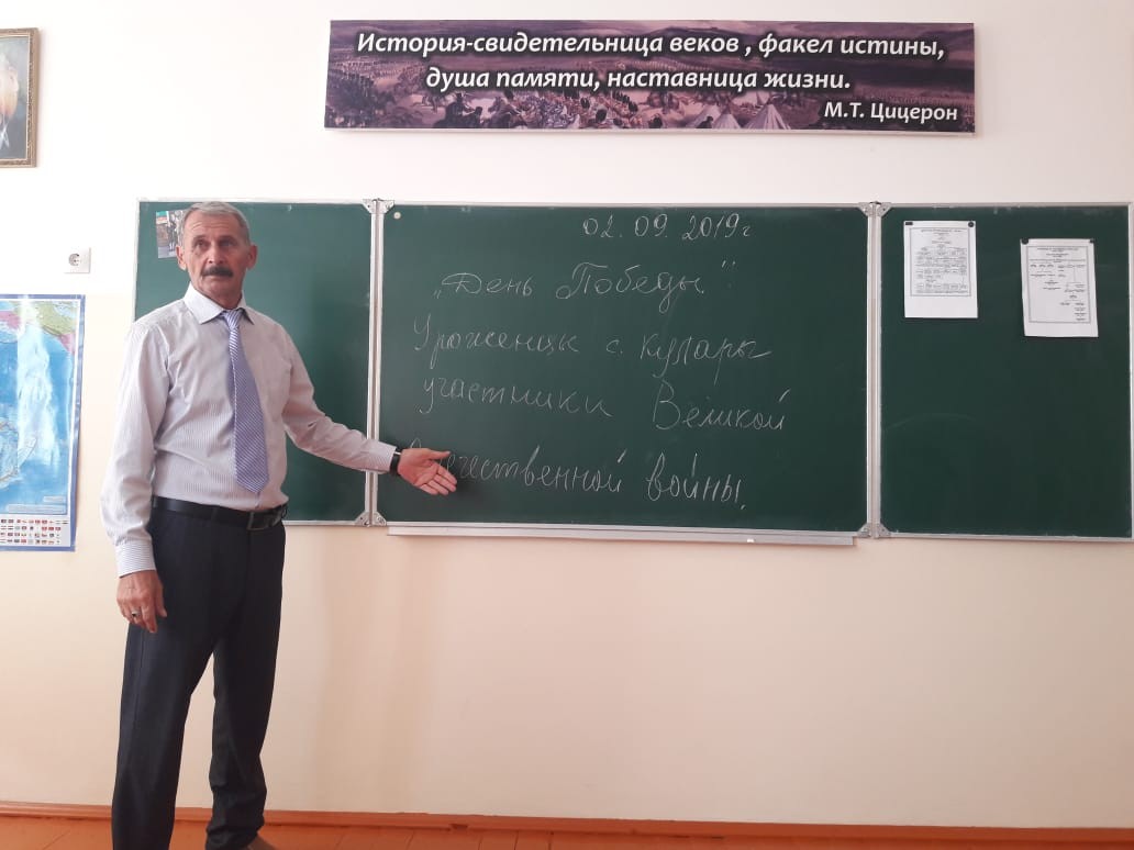 02.09.2019В целях сохранения исторической памяти и в ознаменование 75-летия Победы в Великой Отечественной войне 1941-1945 годов в МБОУ «СОШ №1 с.Кулары» по окончании праздника посвященного Дню знаний, в 9-11 классах, классными руководителями были проведены Уроки Победы!.
