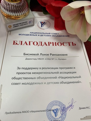 Благодарность Бисиевой Л.Р. За поддержку в реализации программ и проектов межрегиональной ассоциации общественных объединений « Национальный совет молодежных и детских объединений»