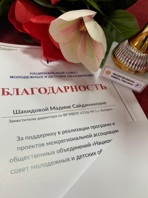 Благодарность Шахидовой Мадине Сайдаминовне заместителю директора по ВР за поддержку в реализации программ и проектов межрегиональной ассоциации общественных объединений « Национальный совет молодежных и детских объединений»