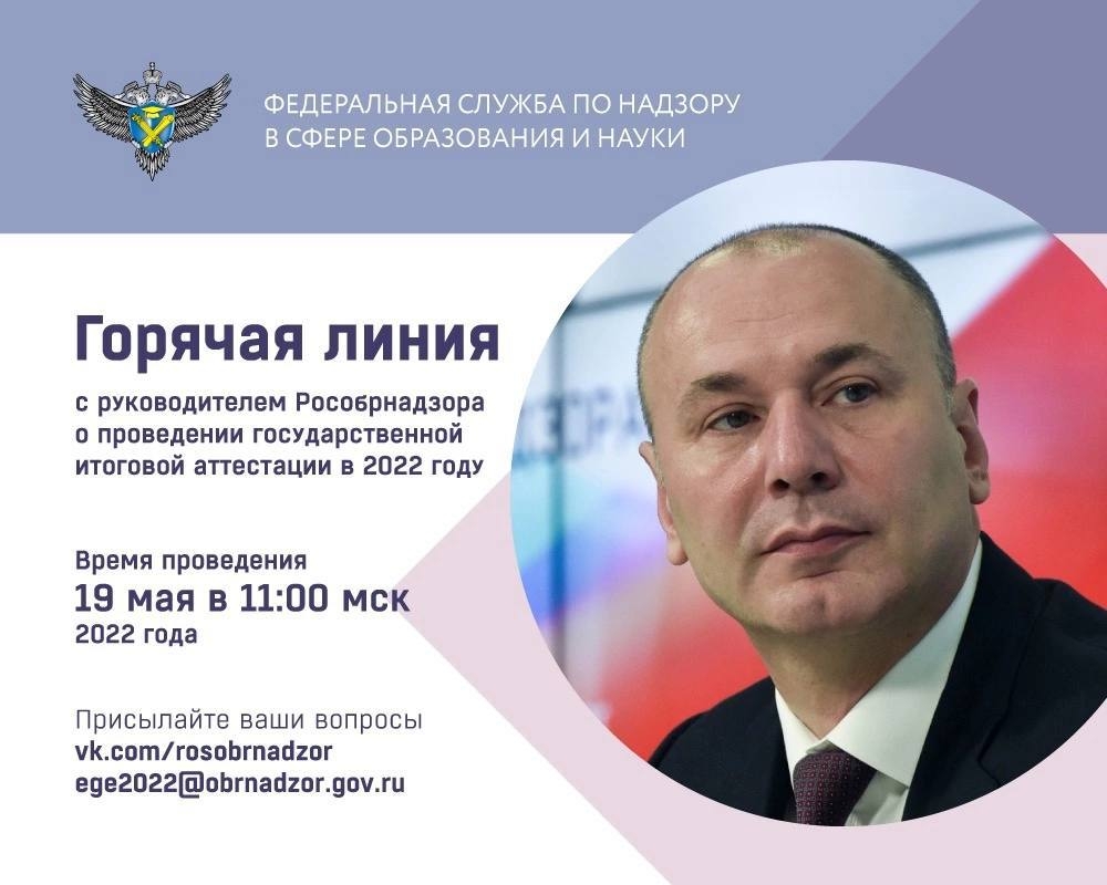 Руководитель Рособрнадзора ответит в прямом эфире на вопросы о проведении государственной итоговой аттестации в 2022 году. Горячая линия пройдет в Ситуационно-информационном центре Федеральной службы по надзору в сфере образования и науки 19 мая в 11:00 мск. Трансляция будет вестись в прямом эфире в сообществе Рособрнадзора в социальной сети «ВКонтакте».