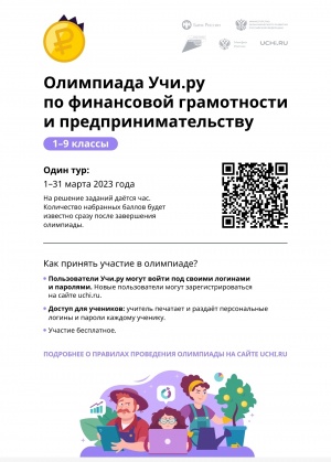 Как разумно распоряжаться карманными деньгами, планировать покупки и уберечься от мошенников поможет разобраться онлайн-олимпиада на образовательной платформе Учи.ру. Олимпиада для школьников с 1 по 9 класс даст ответы на самые важные финансовые вопросы. Мероприятие проводится при содействии Банка России, Минфина России, Минэкономразвития России в соответствии с задачами национального проекта «Малое и среднее предпринимательство». Интерес к олимпиаде с годами растет: в 2021 году в ней участвовали более 800 тыс. школьников, а в 2022 году – более 1,6 млн.