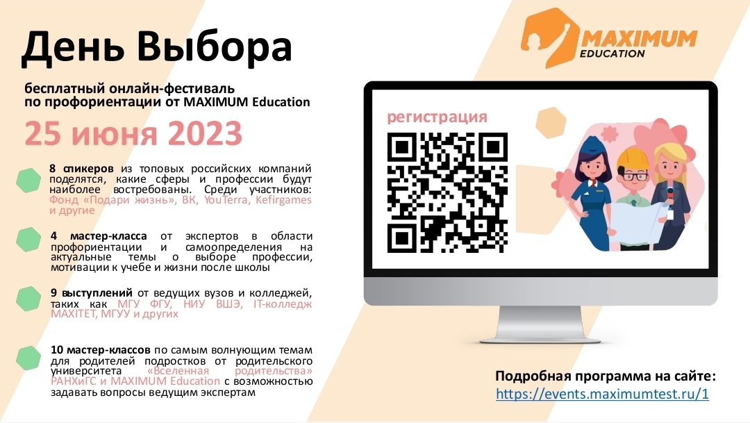 Информируем вас о проведении и возможности принять участие учащимся 5–11 классов и их родителям в бесплатном фестивалепо профориентации «День Выбора», который пройдет в онлайн-формате 25 июня 2023 год