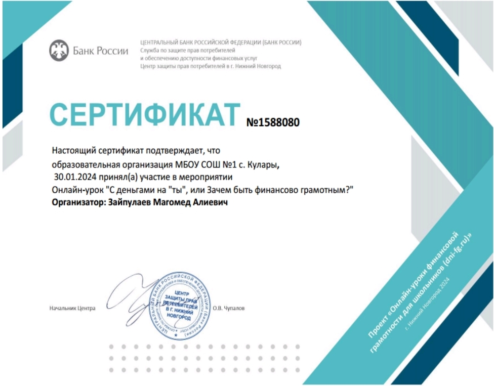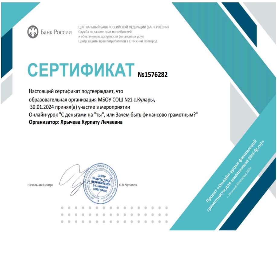 В целях расширения и углубления представлений о доходах, формирования навыков грамотного обращения с деньгами и приумножения собственных сбережений в 7-9 классах МБОУ «СОШ №1 с.Кулары» проведен онлайн-урок финансовой грамотности «С деньгами на Ты или зачем быть финансово грамотным». Образовательные ресурсы для урока в рамках Всероссийского урока финансовой грамотности предоставлены Центральным Банком Российской Федерации.