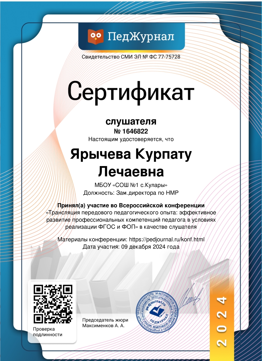 Зам.директора по НИР К.Л.Ярычева приняла участие во Всероссийской конференции "Трансляция передового педагогического опыта: эффективное развитие профессиональных компетенций педагога в условиях реализации ФГОС и ФОП" в качестве слушателя.