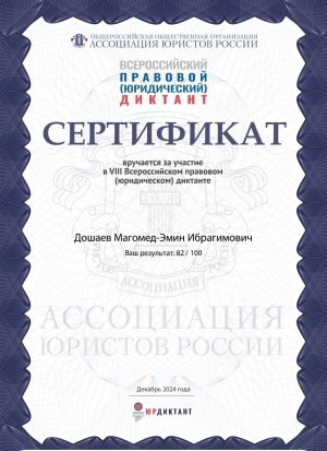 С 3 по 12 декабря 2024 г. проходит VIII-й Всероссийский правовой (юридический) диктант, организатором которого традиционно выступает Ассоциация юристов России при поддержке ряда государственных и общественных организаций. В 2024 г. диктант впервые разделён на три блока: «Базовый», «Профессиональный» и «Бизнес», в каждом из которых участникам предлагается за 60 минут ответить на 33 тестовых вопроса, в том числе видеовопросы от известных юристов, государственных и общественных деятелей. С 4 декабря по 11 декабря 2024г. учителя и учащиеся МБОУ «СОШ №1 с.Кулары» (38 человека) приняли участие в тестировании. По завершении теста каждый участник получил сертификат о прохождении диктанта с персональным результатом и доступ к информационным материалам по допущенным ошибкам.