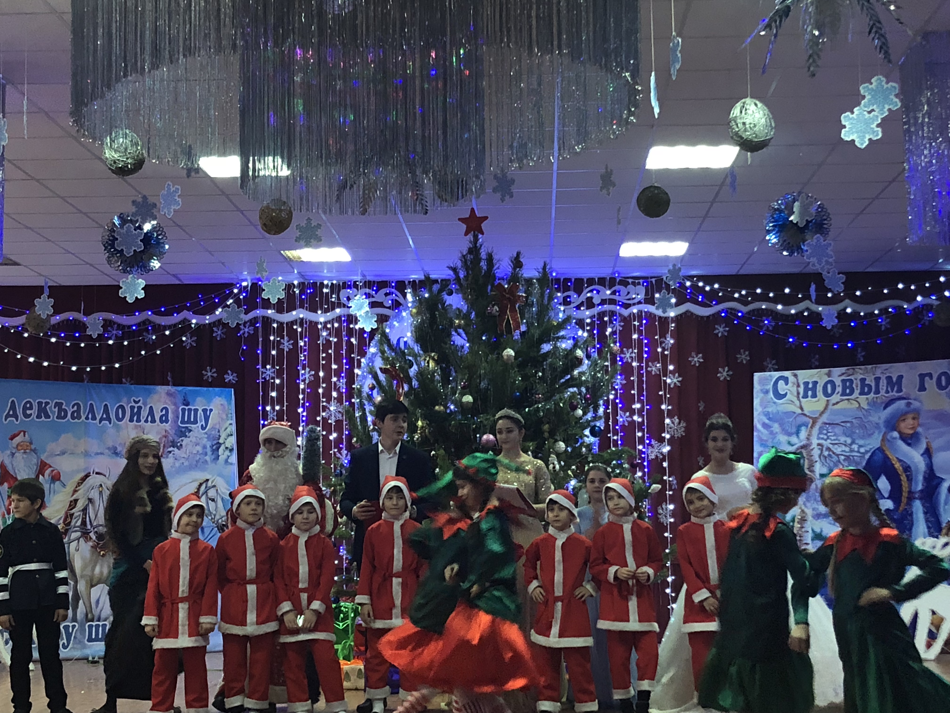 Нарядная елочка весело сверкала разноцветными огоньками. Для учащихся был устроен самый настоящий бал, актовый зал был украшен красивой большой люстрой, по всему залу в воздухе кружились легкие снежинки. Праздник начался с поздравления директора школы Л.Р.Бисиевой, которая поздравила всех с праздником и пожелала успехов в новом году.